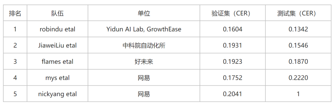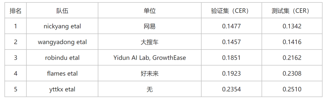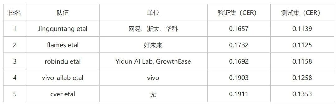 下面的表格列出了在赛道三上提交系统的Top5结果。Yidun AI Lab、中科院自动化所、好未来三个团队分获赛道三前三名。