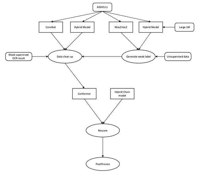 赛道二旨在使用含有视觉模态字幕标注的数据,来训练音频字幕识别系统。nickyang etal队伍设置的方案中,同时训练了若干个ASR模型,并将所有模型的输出融合为最终结果。在数据预处理部分,对于含有字幕标注的训练集,方案通过构建解码图,并应用简单的卷积网络计算语句置信度,得到文本标注信息;对于不含字幕标注的训练集,方案使用微调的wav2vec2.0模型得到文本的语言特征,再使用预训练的语言模型和Kaldi解码器得到文本标注信息。然后,在模型训练部分,该方案分别使用了混合模型和端到端的Wenet模型共同训练,并通过循环往复的方式得到更优的训练集标注,进行更新迭代,从而得到了最优的文本识别结果。