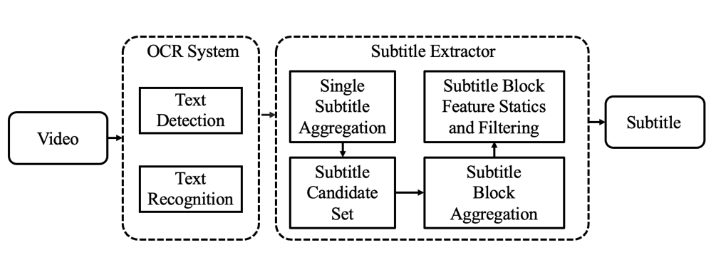 赛道一旨在使用含有音频字幕标注的数据,来训练视觉模态的字幕识别系统。Jingquntang etal设置的方案中,模型主要分为三个部分:文字检测、文字识别以及字幕提取部分。由于字幕标注信息是跨模态的弱监督标注数据,因此文本识别模块难以训练。为了解决该问题,冠军方案使用构造数据的方式来解决该问题。首先,该方案使用文本检测模块检测视频帧中的文本并将文本进行抹除。接着,该方案将音频提供的字幕信息与抹除文字后的帧生成新的视频帧。该方案使用大量的生成数据对文字识别模块进行有效训练。字幕提取模块通过对比前后帧的字幕内容、IoU信息、和文本框位置来提取字幕。