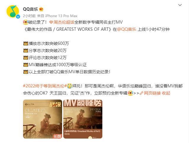 近日,华语音乐圈最大的新闻就是周杰伦宣布将发布全新的专辑《最伟大的作品》,并于今日正式在QQ音乐等平台发布先行曲的MV,对新专辑进行预热,MV发出后瞬间点燃了全网。在MV中,周杰伦在弹奏之际穿越到1920年热闹的午夜巴黎,并且还大秀魔术,还向多位伟大的艺术家致敬,音乐风格非常有个人特色,并且钢琴家朗朗也参演了MV,并在MV中与周杰伦进行钢琴对弹,满足了歌迷视觉听觉双重享受。作为拥有周杰伦歌曲音频授权的QQ音乐,先行曲的MV播放量早已超过800万,其他平台的播放量也在非常快速的增长,微博17分钟转发量已过四万,点赞量接近10万,抖音周杰伦官方账号MV点赞量已过30万,足可以见得歌迷对新专辑的期待。据悉,《最伟大的作品》是周杰伦的第15张个人专辑,距离上一张专辑已有6年之久,该张专辑将于7月8日正式开启预售,数字专辑于7月15日上架,实体专辑发行日尚未确定。今日除周杰伦新专辑先行曲MV发布外,腾讯音乐娱乐集团还宣布与杜比实验室达成战略合作,为QQ音乐上线杜比全景声音乐功能。据了解,QQ音乐为国内第一家上线杜比全景声的平台,目前超级会员用户使用支持杜比全景声的安卓手机,登录QQ音乐11.8新版本搜索“杜比 / 杜比全景声”可进入专区进行收听。据QQ音乐官方发布,目前支持的有毛不易、周深、五月天、萧敬腾、袁娅维、欧阳娜娜、INTO1、Ed Sheeran、Coldplay、Roddy Ricch、Sia等全球受欢迎的歌手、乐队、音乐人的杜比全景声歌曲,歌曲涵盖了流行、古典、摇滚、电子、说唱等各种音乐类型。据报道,在官宣后双方均表示后续将继续合作,将杜比全景声拓展到更多场景。