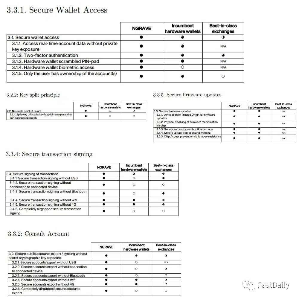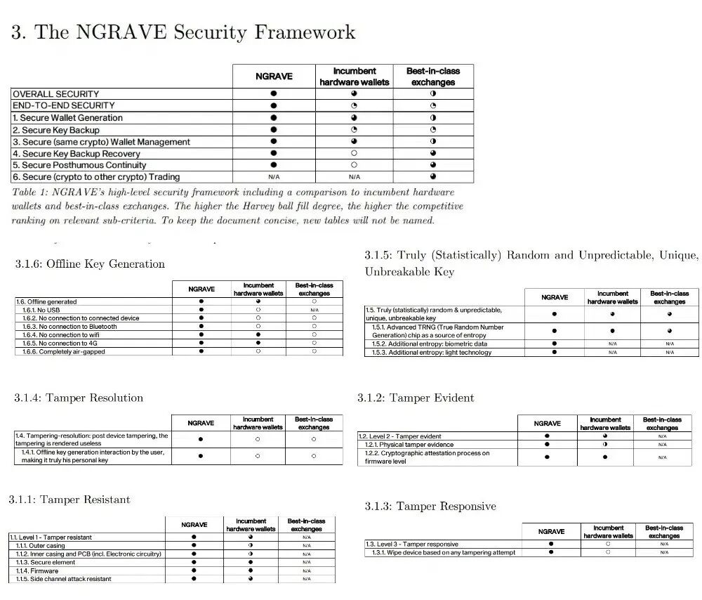 除了通过EAL7认证外,与Ledger持有的EAL5认证相比,ZERO还通过了Trezor持有的ROHS认证和CE认证。通过持有所有这些认证,NGRAVE ZERO获得了世界上最高的安全保证和认证,比当今市场上现有的硬件钱包明显领先一步。下面我们来看看NGRAVE的安全框架,以及根据NGRAVE白皮书,它与其他加密货币存储解决方案的比较: