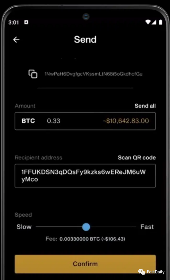 交易速度无需调整,因为应用程序将自动选择最佳费用。点击确认后,你将进入另一个屏幕,该屏幕将显示交易的详细信息,以及可扫描的二维码,请确保仔细检查所有交易详细信息。