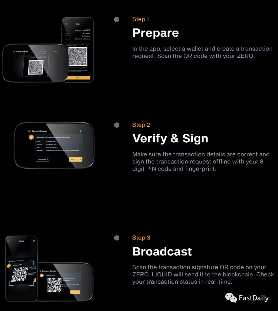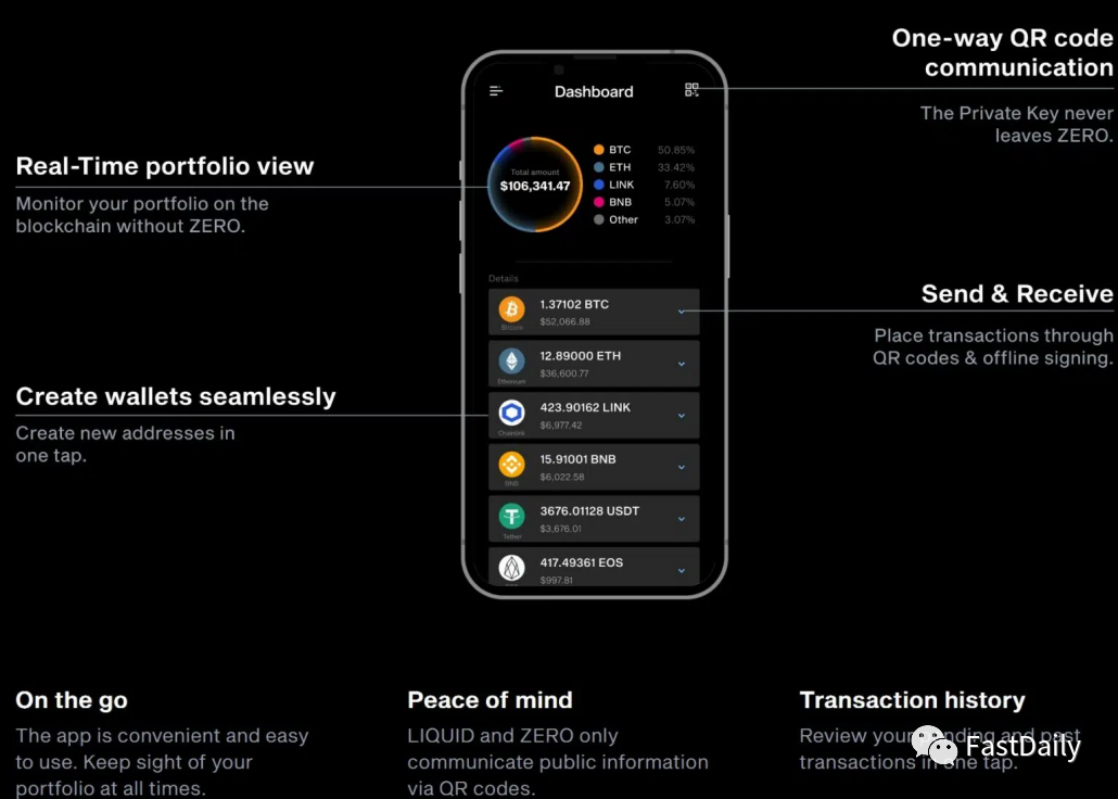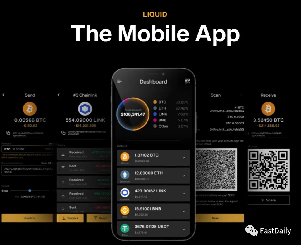 一旦应用程序下载到手机上,可以通过扫描二维码在两台设备之间同步帐户,这是ZERO和LIQUID移动应用程序之间所有通信的方式。钱包与LIQUID交互,LIQUID随后与区块链通信,永远不会暴露私钥。