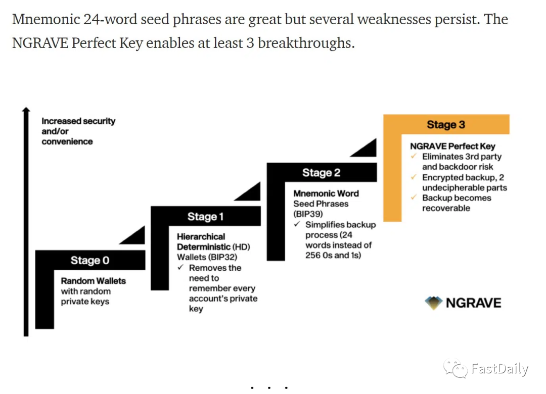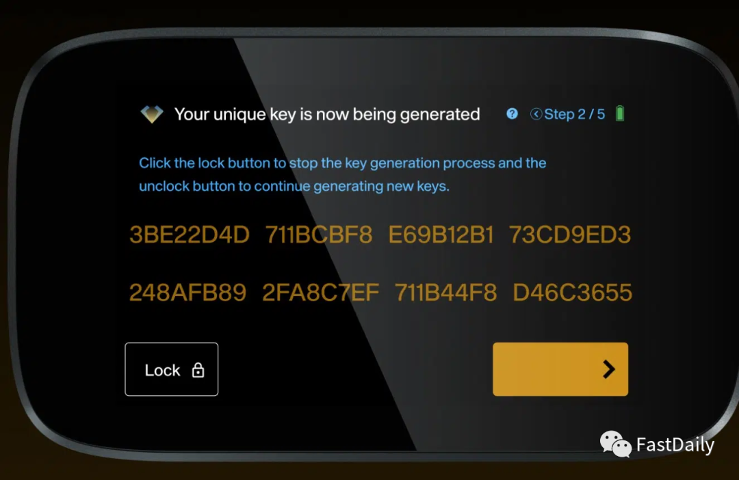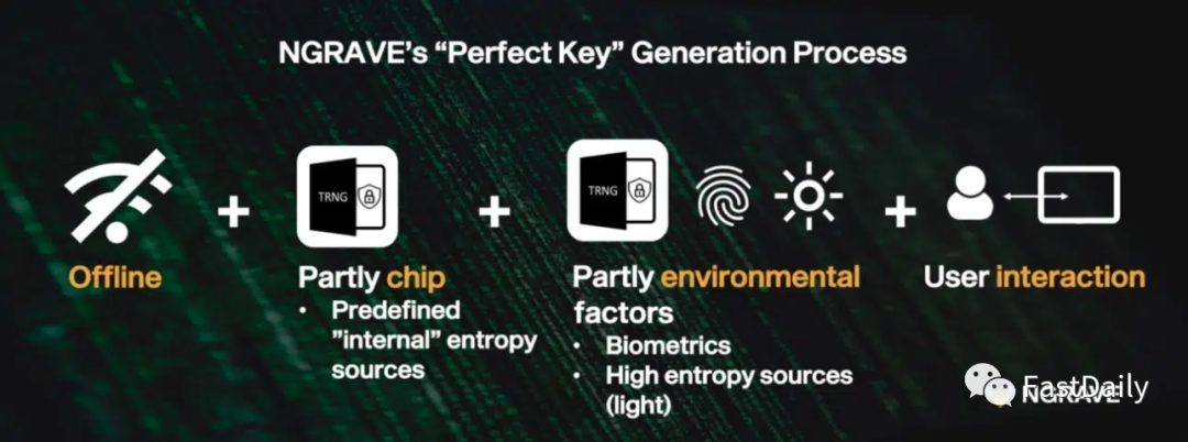 其工作原理是,当用户首次设置设备时,不会像其他加密货币钱包那样附带一个预设的恢复短语,而是通过一系列步骤来设置“NGRAVE Perfect Key”,其中密钥将在屏幕上洗牌,用户可以选择在任何时候停止洗牌,然后进一步随机选择密钥的一部分来交换其他部分密钥。