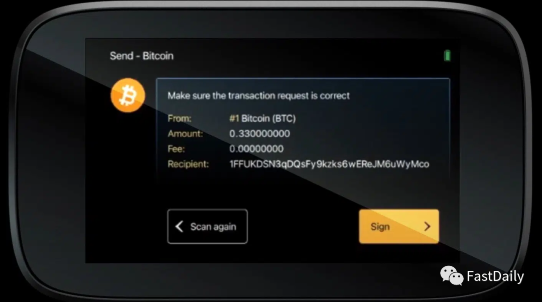 然后你需要拿起ZERO设备,点击扫描图标或输入你想要发送的硬币,然后扫描手机上显示的二维码。之后,ZERO将提示你签署交易。