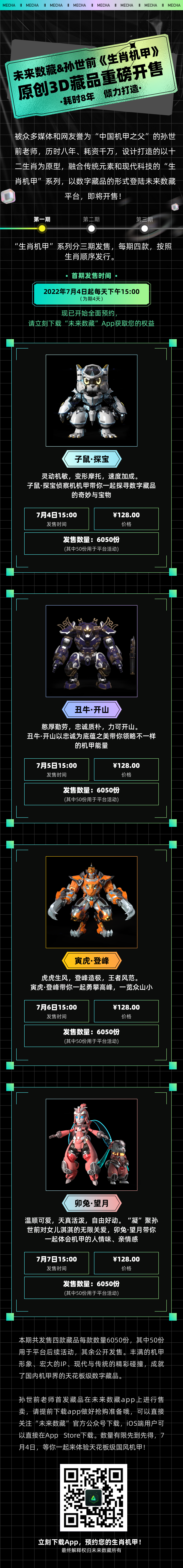 从人群中的歌声到墙壁上的文字,人们学会了记录;从书简上的文字到幕布后的光影,人们保存了美好;从传统的平面数藏图片,到每一个零件都清晰可见的3D变形数字藏品,今天,未来数藏再次以高质量的原创精神,为您带来IP巨作——孙世前工作室作品《生肖机甲》!