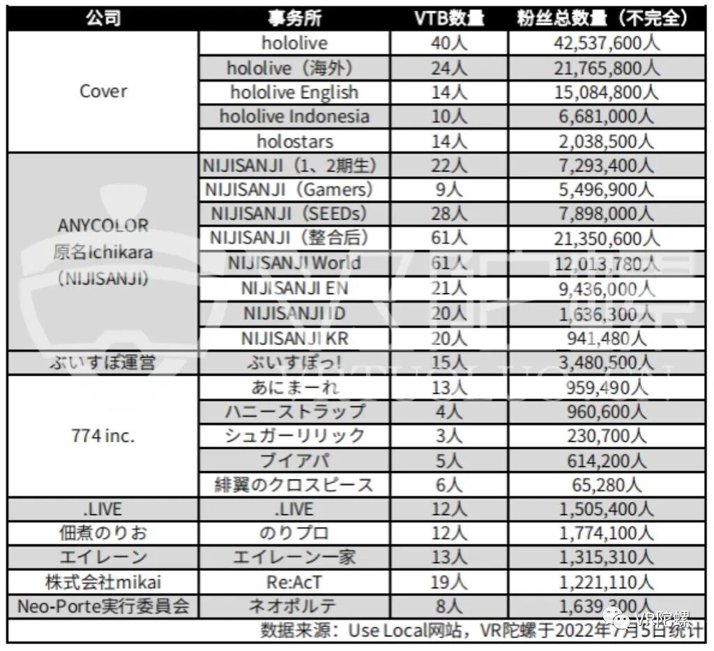 日本虚拟主播主要运营公司及虚拟主播数量、粉丝数统计(节选):