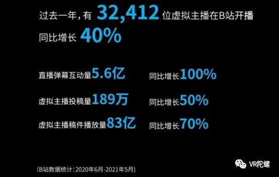 在2021年6月,B站CEO陈睿在B站12周年庆上表示,过去一年(2020年),一共有32,412名虚拟主播在B站开播,同比增长40%。直播弹幕互动量达5.6亿,同比增长100% ;虚拟主播投稿量达到189万,同比增长50%;虚拟主播稿件播放量达83亿,同比增长70%。