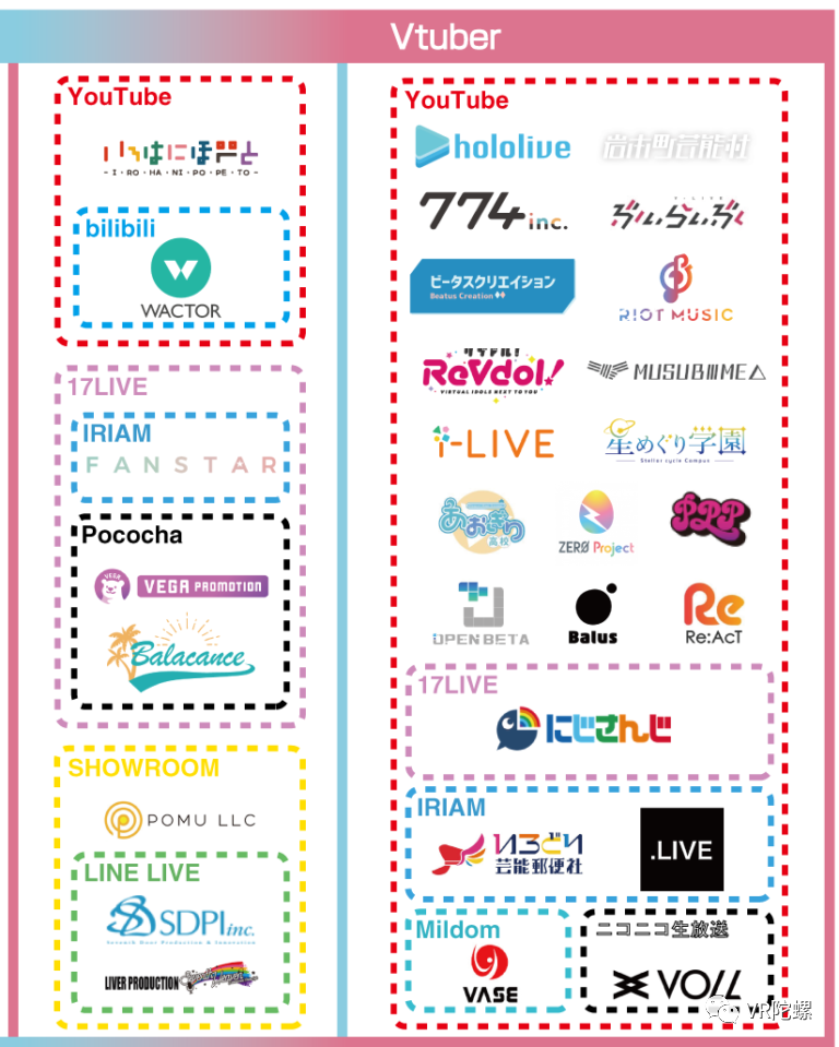 目前,海外VTB主要活跃于YouTube和Twitch,此外也开始延伸到不少新的媒体平台,如海外版抖音TikTok、SHOWROOM等。除个人势/社团势VTB以外,绝大部分VTB都是通过公司的事务所企划出道的,目前有几家较为活跃的公司,如彩虹社(Ichikara)、.LIVE、hololive(Cover)等。