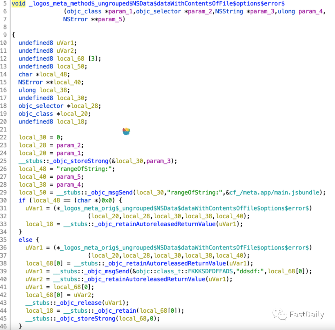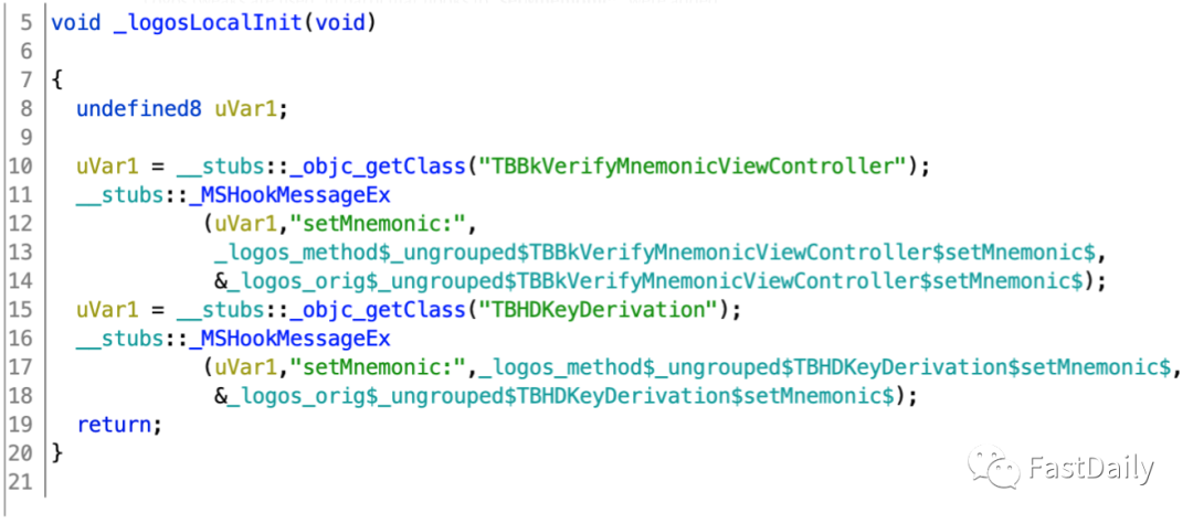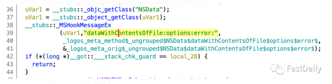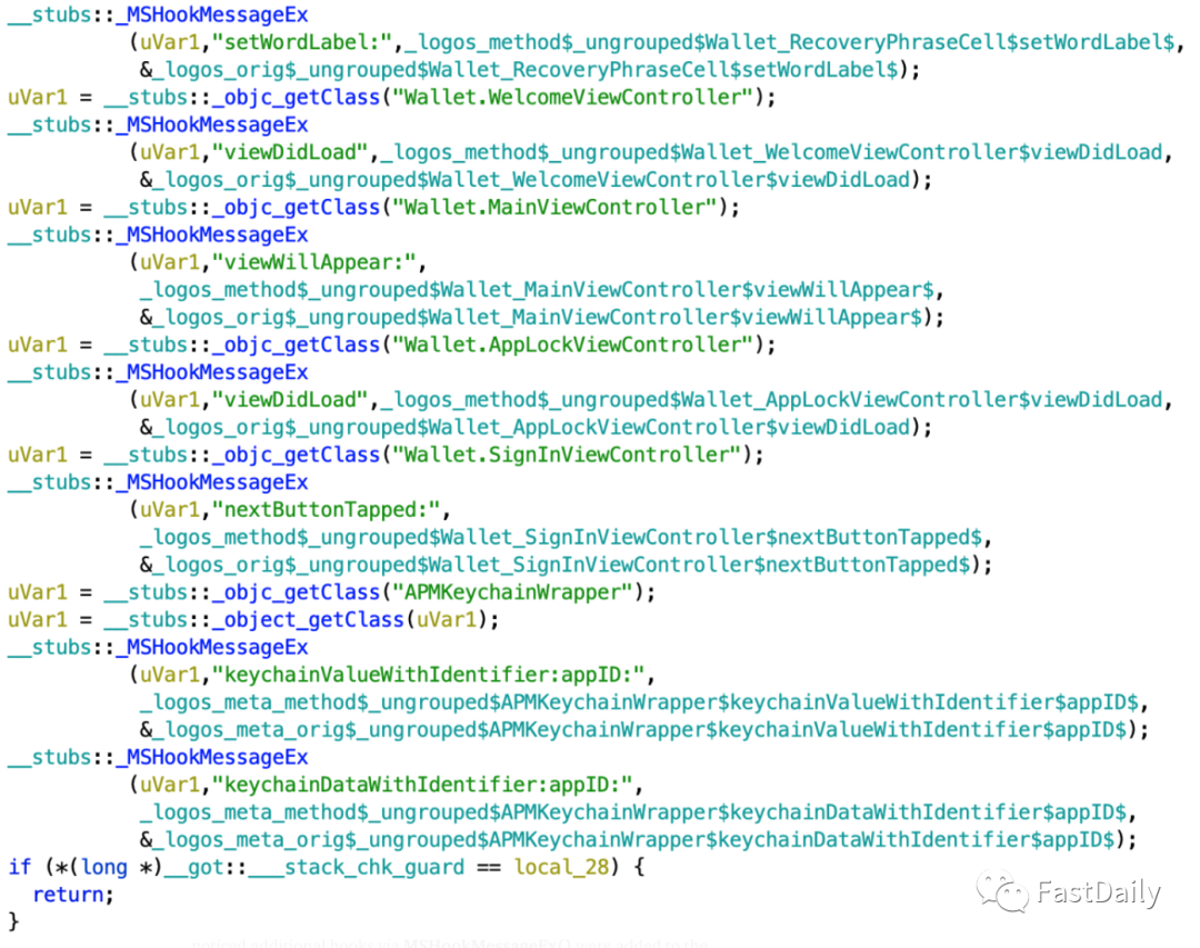 Logos 还与应用程序的多个 ViewController 上的多个 MSHookMessageEx() 挂钩一起使用,每次都回调特定的后门代码方法: