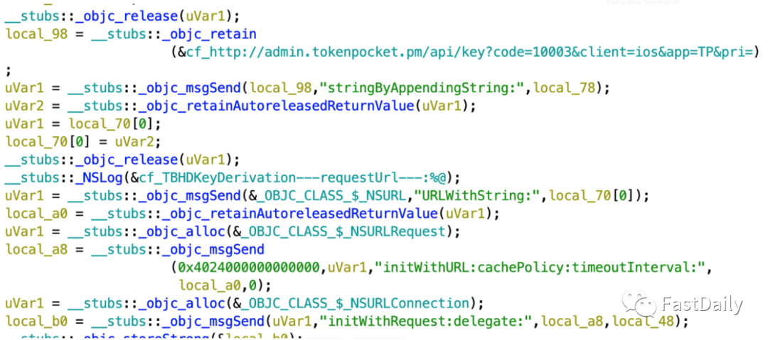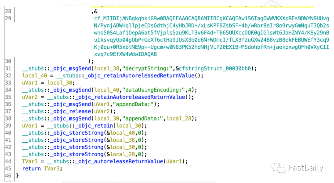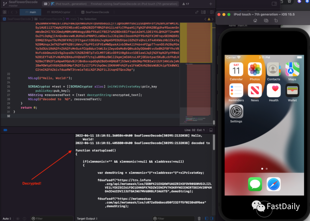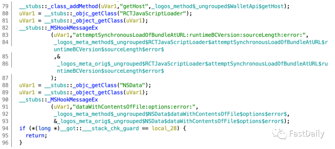 后门被隐藏和加密,与 Metamask iOS 钱包中相同,我发现加载的后门 React Native 包完全相同。我们注意到通过 MSHookMessageEx() 的附加钩子被添加到 RCTJavaScriptLoader 中,确保最终加载后门 React Native 包: