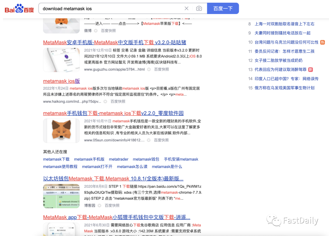最后一个要回答的问题是,用户是如何被锁定并转到这些提供欺诈钱包的网站的?简短的答案——搜索引擎。事实上,搜索引擎是我们迄今为止发现的SeaFlower的明显入口之一,它将移动用户重定向到假的/克隆的钱包下载网站。特别是,百度搜索引擎的结果是这些攻击的初始载体之一。