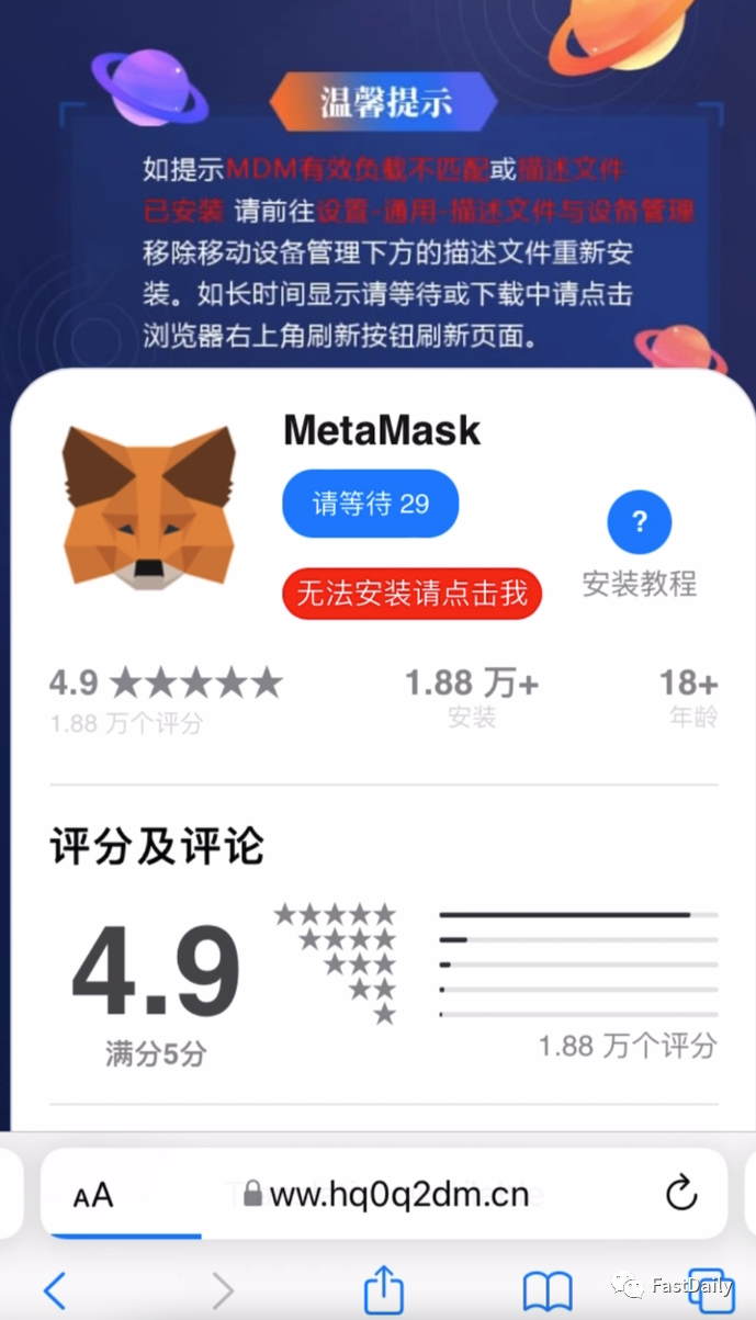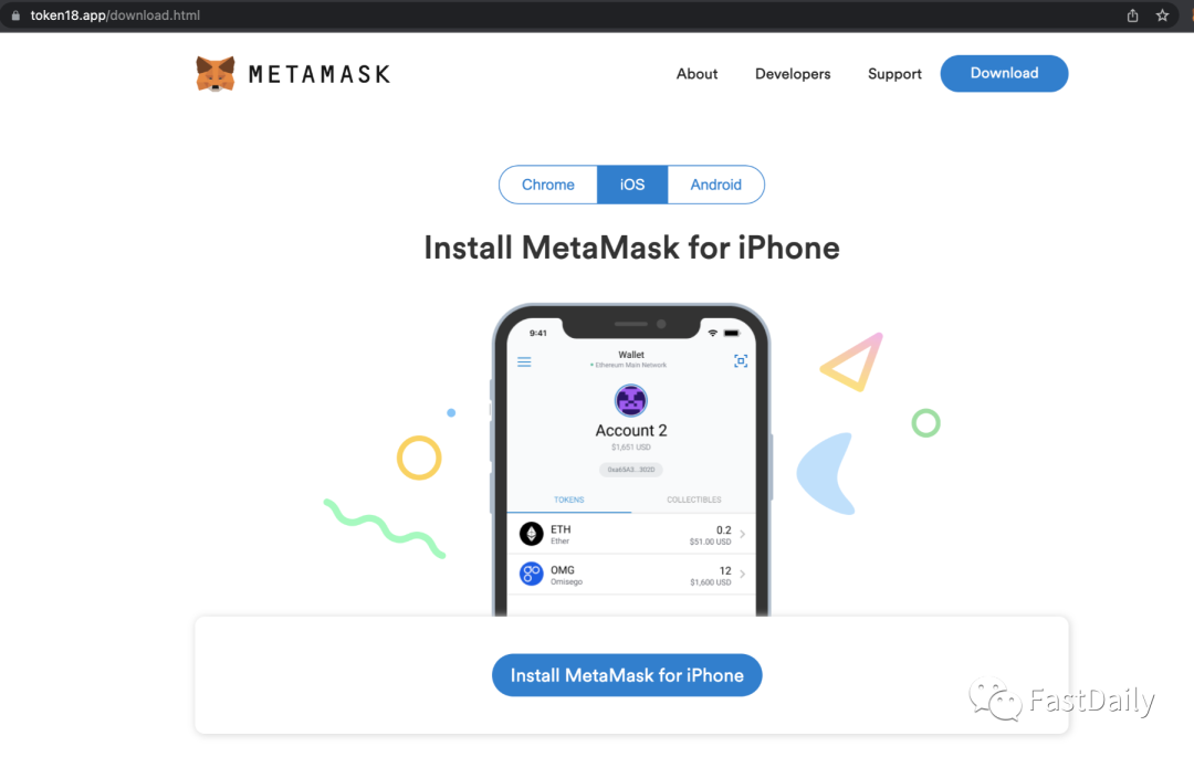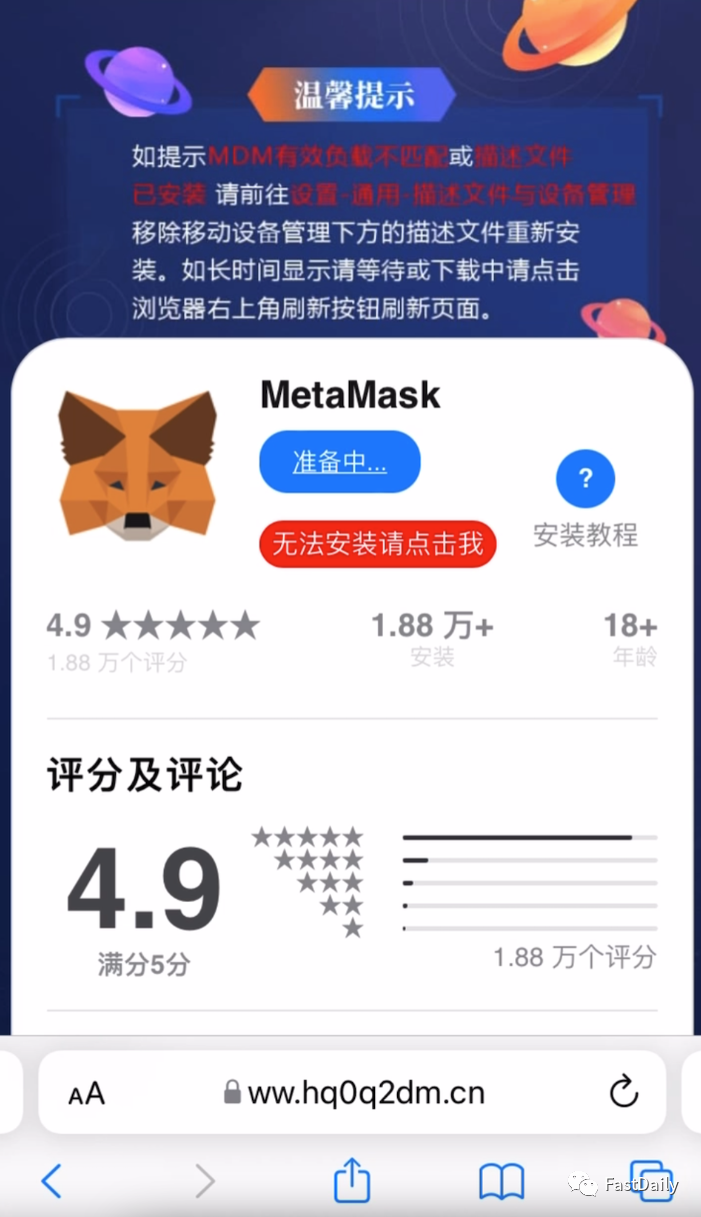 我们搜索 "下载metamask ios",第一个结果页上的一个百度链接将我们重定向到token18[.]app网站,这是SeaFlower Drive-by下载页面,很贴心!"。