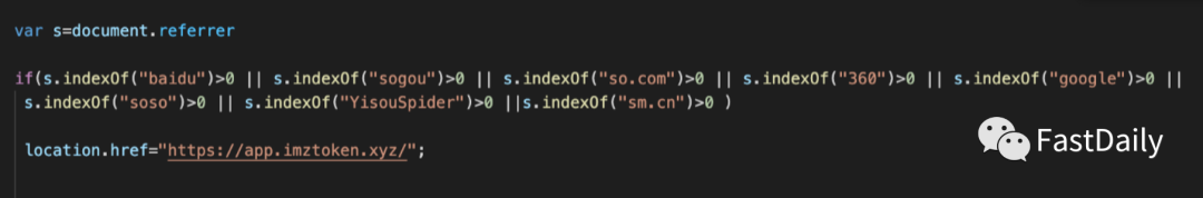 在监测结果的时候,我们开始注意到有一个网站的intermediate,它在重定向到SeaFlower的偷渡页面之前做了指纹识别。我们从HTML页面中提取了客户端指纹,我们发现了一个代码,用来检查参考者是否符合不同的搜索引擎,实际上是多个中文搜索引擎。