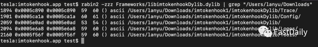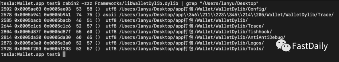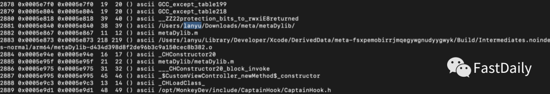 转储字符串,我们发现与 metamask Wallet iOS 应用程序中相同的作者 macOS 用户名“lanyu”,确认我们正在处理相同的作者,并确认使用相同的 Monkeydev xcode 模板: