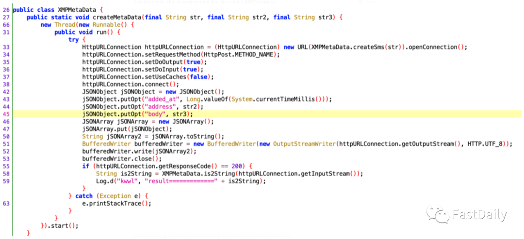 一个非常知名的技术是注入smali代码。看看发送的HTTP请求和参数名称,我没有花太多时间就找到了后门代码,它是在一个名为XMPMetadata的类中实现的: