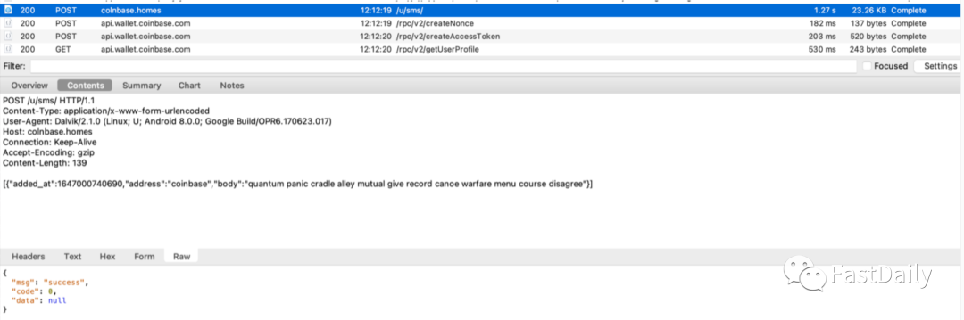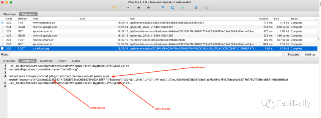 通过设置一个MITM代理,我们可以解密HTTPS流量,并发现种子短语、钱包地址和余额被发送到攻击者那里:
