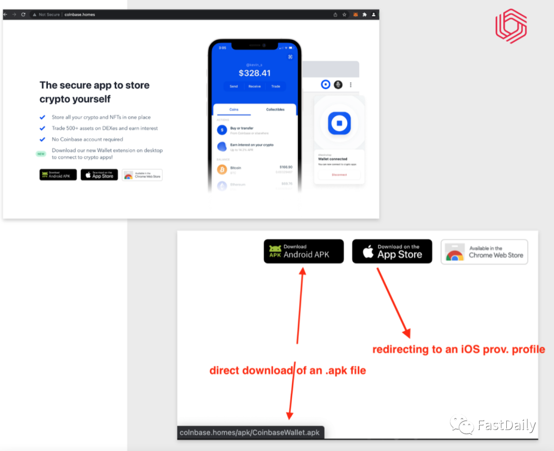 SeaFlower还通过建立假的克隆网站来处理应用程序的分发阶段,在那里可以下载这些被反封锁的钱包。被识别的网站是合法网站的完美克隆,并提供下载链接: