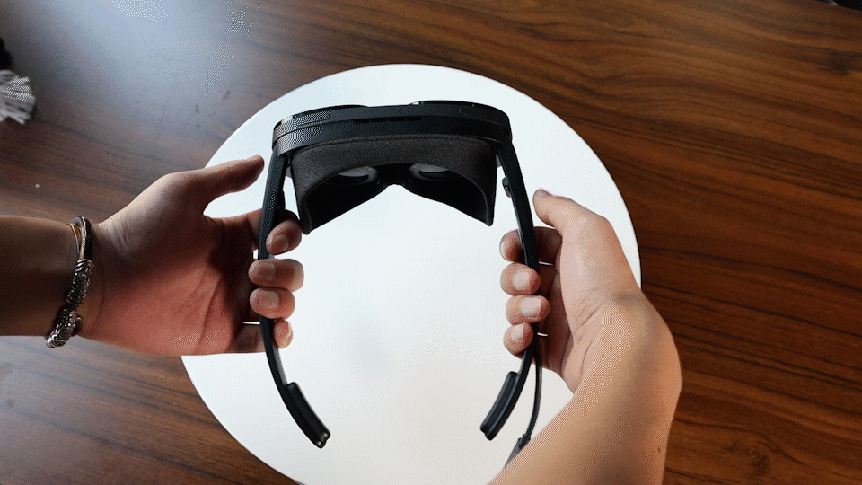 在佩戴感方面,HTC VIVE Flow 采用了磁吸式可拆卸面罩,并附赠了一个鼻托。在这一环节上,我们必须要夸夸 HTC VIVE:其开发组自始至终都很注意亚洲人的脸型和佩戴体验,相对于其它欧美厂商,这种细节就显得格外贴心。另外,官方还给 Flow 加入了双铰链贴合系统,它能在很大程度上贴合各种头型,从而避免在使用时的“掉落风险”。