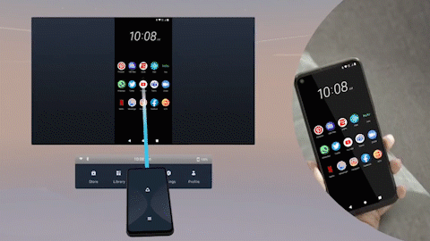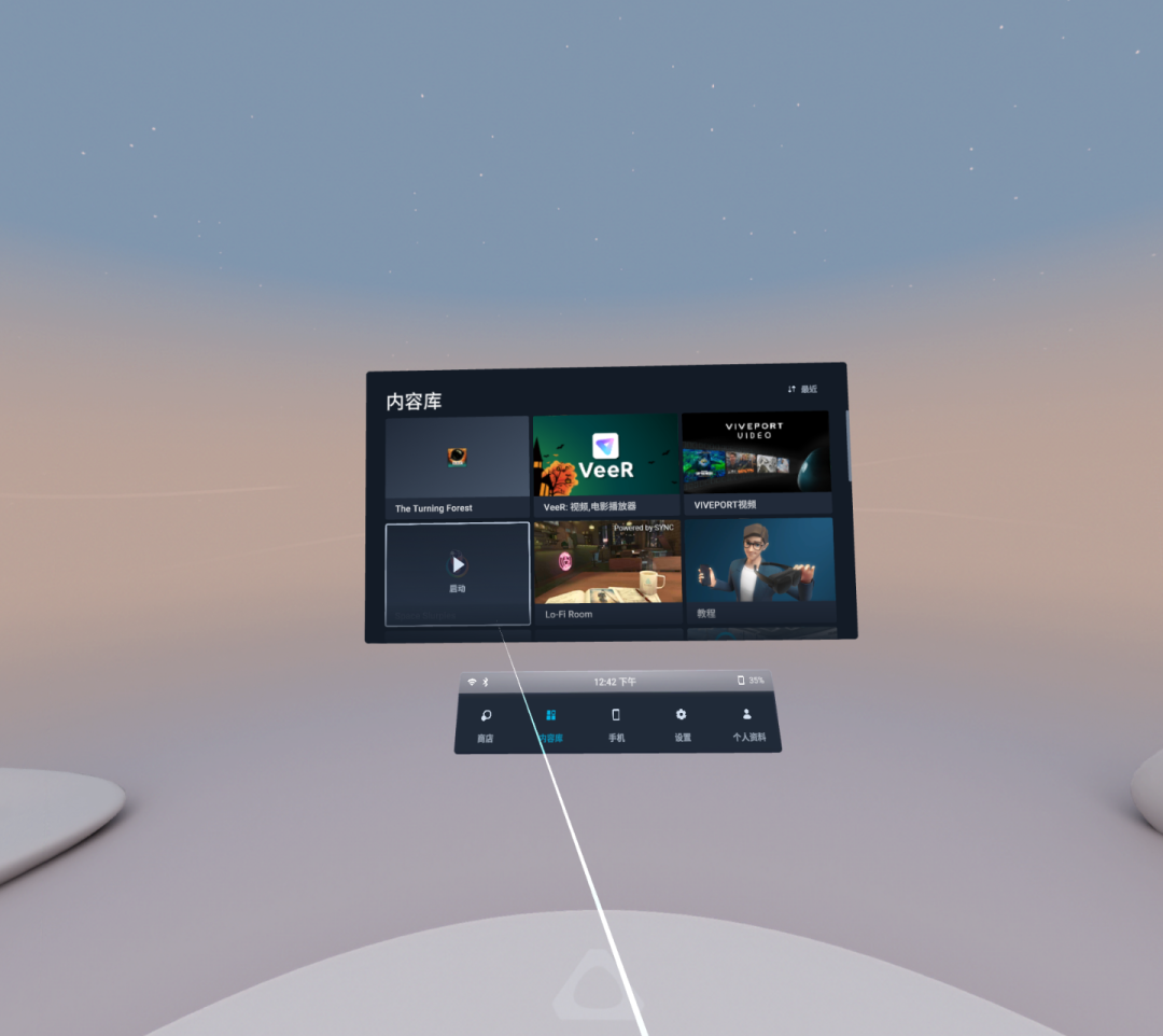 接下来,让我们看看 HTC Flow 引以为傲的投屏功能。与其他VR/AR设备的投屏不同,用户在 HOME 界面下就能找到手机选项,点选之后就能将手机画面投到 Flow 头显内,此时的所有数据都会通过无线进行传输。