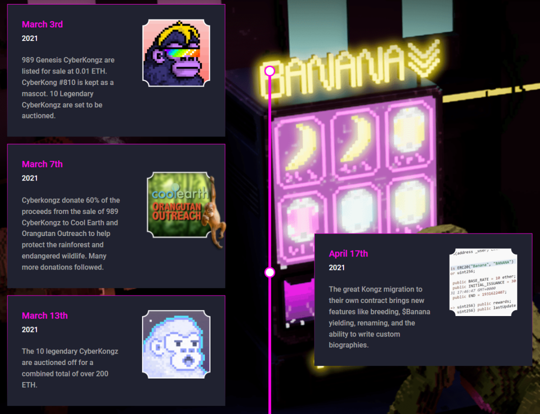 随着时间的推移,以及CyberKongz社区的壮大,社区中一些在NFT和De-Fi领域最优秀的开发者和专家,开始尝试提供他们的技能和时间来发展社区。在很短的时间内,$BANANA代币被创造出来,使 Genesis CyberKongz 有能力在未来十年内每天产生 10 个 BANANA 代币,而 Genesis CyberKongz 的持有者可以通过销毁 BANANA 代币用于更改他们的CyberKongz特征,如独特的名字和传记,拥有 2 个以上 Genesis CyberKongz 则可以销毁 600 枚BANANA 用于培育和孵化4000个随机产生的具有不同特征和稀有性的 Baby CyberKongz (地板价近 10 ETH)。