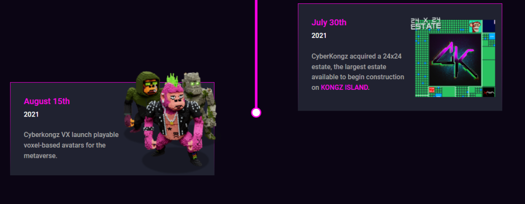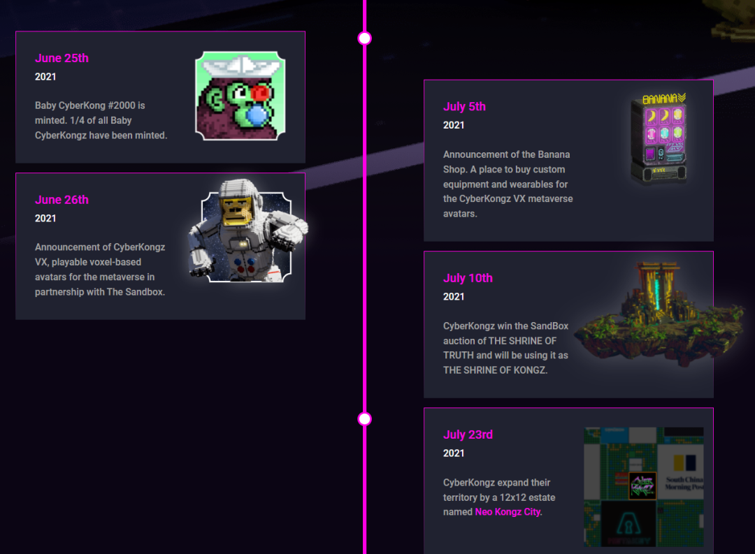 目前整个社区已经打造了一个相当成熟的 NFT 生态, PFP 头像 —— 子项目 Baby Cyberkongz 诞生 —— 应用代币(BANANA)商店 —— 通过 Cyberkongz VX 打造元宇宙框架 —— 入驻 Snoop Dogg 代言的元宇宙游戏平台 Sandbox —— 购买地产建立 Cyberkongz 元宇宙王国 —— 推出基于 Cyberkongz VX 的元宇宙可穿戴装备