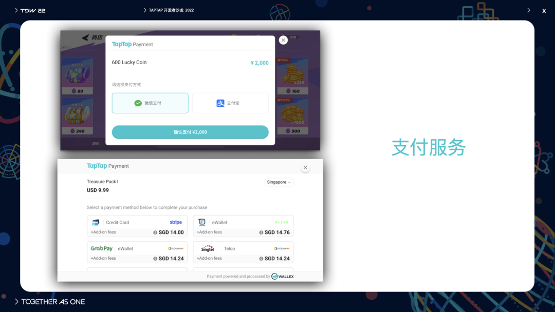 例如,针对海外市场繁杂的支付渠道,TDS 将推出聚合支付服务 TapTap Payment,为接入的开发者提供统一的支付接口,从而可以极大便利地将海外支付接口统一。![]()