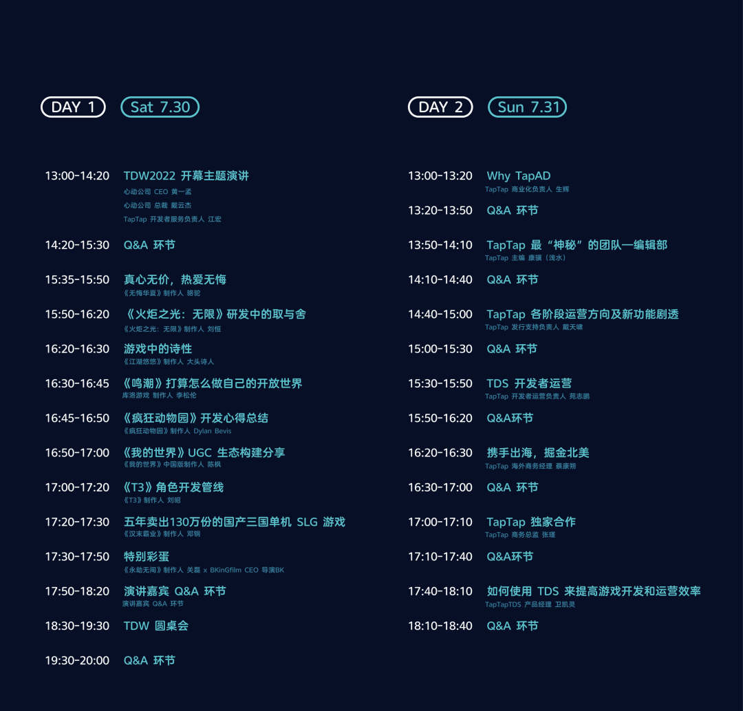 因此,本届 TDW 在活动排期和议程上均进行了优化。沙龙从过往三届的为期一天拓展为两天,并增设了多组 QA 和圆桌论坛环节,也首次单独为 TapTap 各部门负责人开设为期大半天的分论坛,以期更完整深入地与更多开发者分享经验,展示 TapTap 努力为开发者创造的价值。