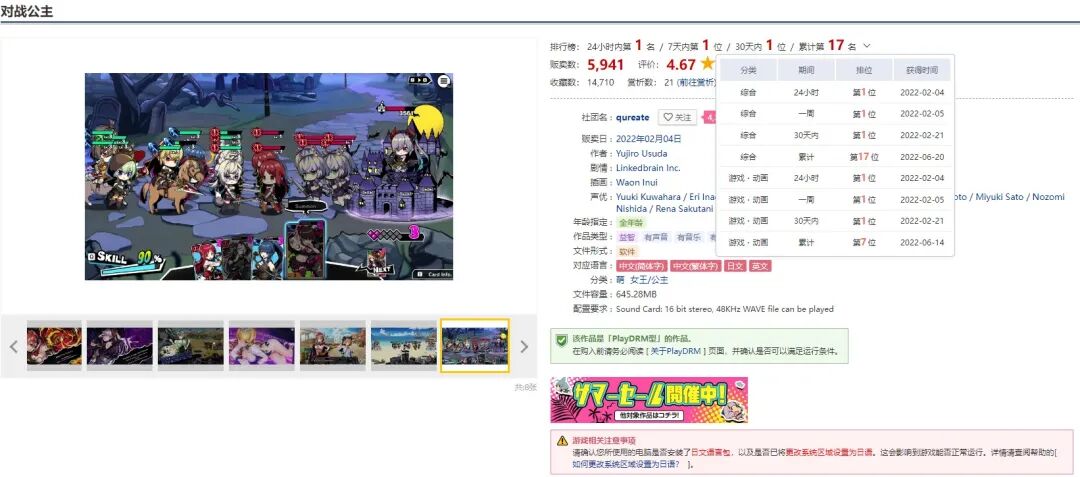 《对战公主》在2022年1月13日在eShop发售,但上架还没满半个月,就因为“不知名原因”下线。如今过了半年多,《对战公主》都没能重回eShop,而是在上架Steam失败后,直接投入DLsite的怀抱。