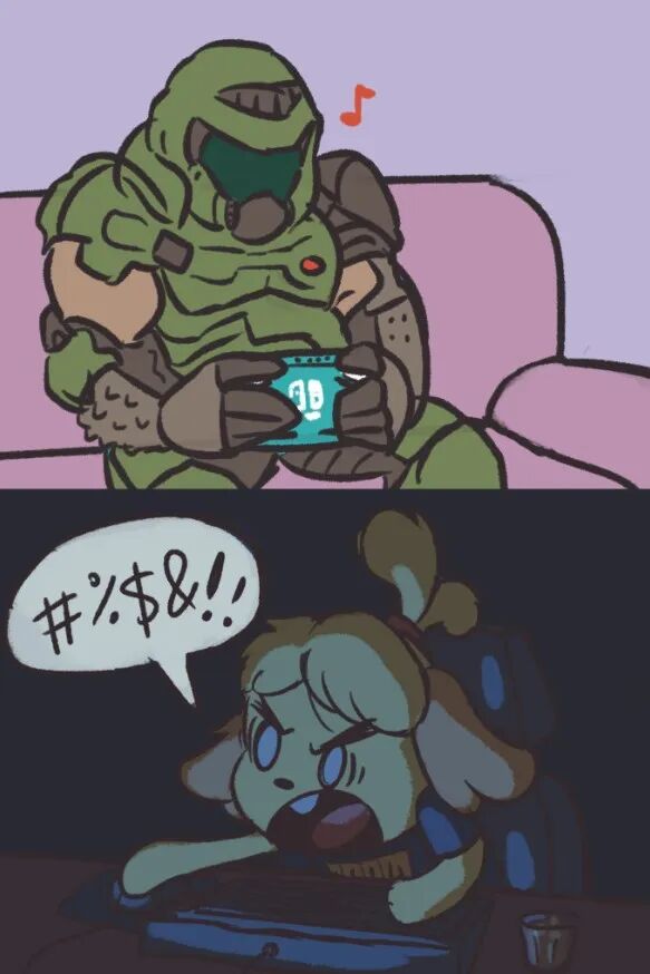 因为同样在2020年3月20日全球首发,暴力血腥拉满的Doom Guy和可可爱爱的西施惠,由于反差萌,一时成为全球网友制作meme的对象。当时流行的meme里,内容大多离不开西施惠拿着BFG大杀四方,或是Doom Guy在“动森”里和小动物们交起了朋友。