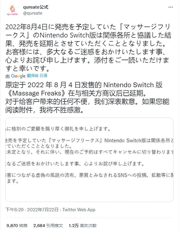 随着在海内外社交媒体的传播,《按摩狂》的热度迅速攀升。但没过几天,另一条新闻就出现了“《按摩狂》Switch版将退回预订玩家购买费用,且发售日期将无限期推迟”。