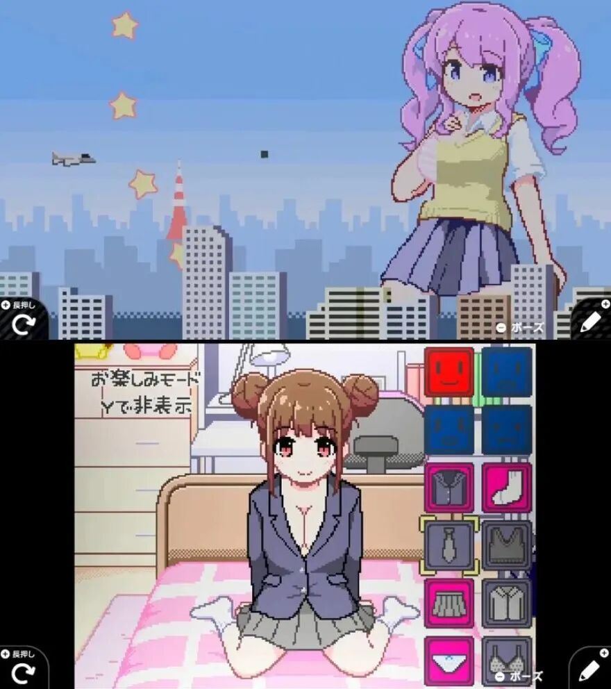 但因为“第一次”足够自由的游戏制作玩法,有玩家就尝试着陆续制作了两款带有“脱衣”福利图的擦边球小黄油:一款是横板弹幕射击,但被弹幕射中的女孩会逐渐爆衣;而另一款游戏是简单的节奏游戏,但目标也是让女孩子的衣物消失。