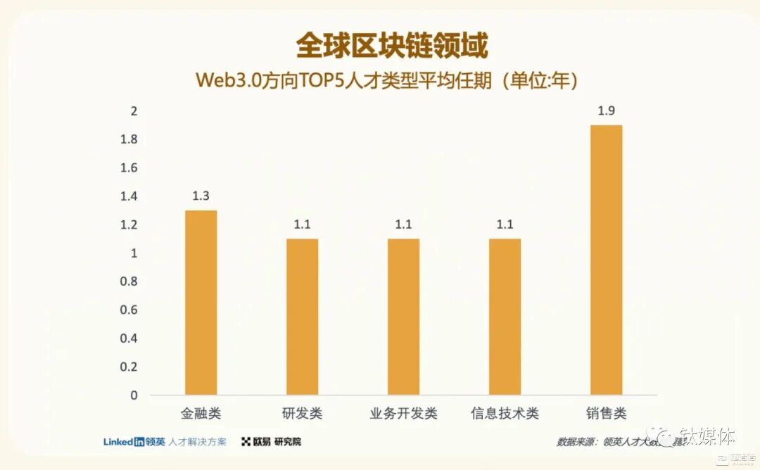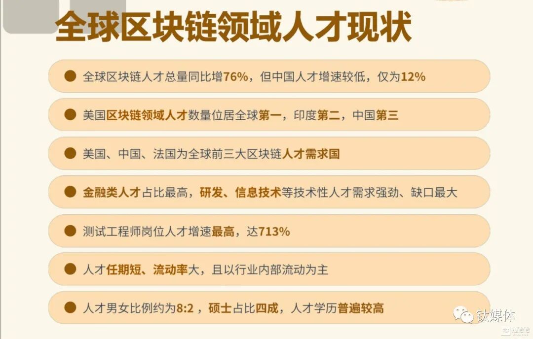 报告从全球人才总量及供需、地域分布、人才增速、热门岗位以及人才性别占比等七个维度对Web3行业进行了全景业态的描绘,通过提炼核心观点:1/人才总量及供需:相较上一年,全球区块链人才总量同比增长为76%;全球区块链领域职位发布量以每季度平均25%的比例增多,总体而言,虽然人才数量呈稳步增长情况,但职位发布量同比增速远高于人才数量同比增速,目前仍处于人才增量赶不上职位增量,人才供需失衡。2/地域分布:目前,美国人才数量位居全球第一,印度第二,中国第三;其中美国、中国、法国为全球前三大区块链人才需求国。3/人才学历:目前,全球区块链领域人才学士群体最大,占比59%,但硕士占比达40%,整体学历相对较高。值得关注的是,全球区块链人才排名TOP10学校均为世界知名院校。4/从业者性别占比:目前全球区块链领域人才男女比例约为8:2,女性人才相对稀缺。5/人才流动:整体上呈现人才任期短、流动率大,且以区块链行业内部流动为主的趋势。目前,全球区块链人才的任职期平均是1.2年。区块链前五大人才类型的平均任期也各有不同,其中,金融类人才平均任职1.3年,研发类人才平均任职1.1年,业务开发人才平均任职1.1年,销售类人才平均任职1.9年。此外,位列全球区块链领域人才需求前五的产品类人才、市场营销人才平均任职均为1.1年。具体而言,除高盛、JPMorgan、HSBS等传统金融公司涌入,谷歌、微软、Facebook等科技公司涌入,人才流动渠道以行业内部流动为主。报告相关数据显示,2021年至今,人才主要在Coinbase、Crypto.com、Gemeni、Ripple等区块链企业间交叉流动。6/热门岗位:这部分的数据无疑是Web2与Web3都重点关注的内容。截至2022年6月,从职位发布量来看,研发类人才位居全球区块链人才需求之首,其次是信息技术类人才。产品管理、市场营销和人力资源类人才紧随其后。一直位居区块链人才数量第一的金融类人才从招聘需求仅位列第六。区块链人才对于技术性人才的需求高缺口大。而造成技术性人才的需求缺口大的主要原因在于区块链行业发展处于早期阶段,大量基础设施需要被搭建。值得一提的是,在报告中提到的以技术驱动的Web3企业中,作为报告联合撰写方的欧易OKX作为原生的Web3企业,其对人才的需求更容易映射出原生Web3企业的人才偏好,正如数据呈现,产研相关岗位一直是招聘的重点,而在各地区业务扩展的情况也会配置一定的增长运营人才与职能支持类专家,相关岗位的热度在企业扩展期间一直比较热门。而欧易的团队中女性员工的比例约有40%,除了企业相对公平的招聘原则外,也可以看到合适的企业文化对于招聘员工也有着不容小觑的作用。7/人才薪酬:除热门岗位外,区块链产业人才薪酬也备受关注,由于全球Web3人才在整体上供不应需,所以区块链专业人士的薪水正在飙升。据Glassdoor报告称,美国区块链开发人员的平均基本工资为91,715 美元/年。中国市场而言,据《2021年北京市人力资源市场薪酬大数据报告》显示,在30个新职业薪酬排行榜中,区块链工程技术人员最高,年度薪酬中位值达487,106元人民币;工业和信息化部人才交流中心2021年12月发布的《区块链产业人才发展报告》也显示,区块链行业整体年薪逐年上涨,从不同岗位薪资来看,核心研发岗位薪酬最高;其中北、上、广、深等重点城市区块链产业人才平均年薪水平大幅领先城市整体产业人才平均年薪水平。![]()