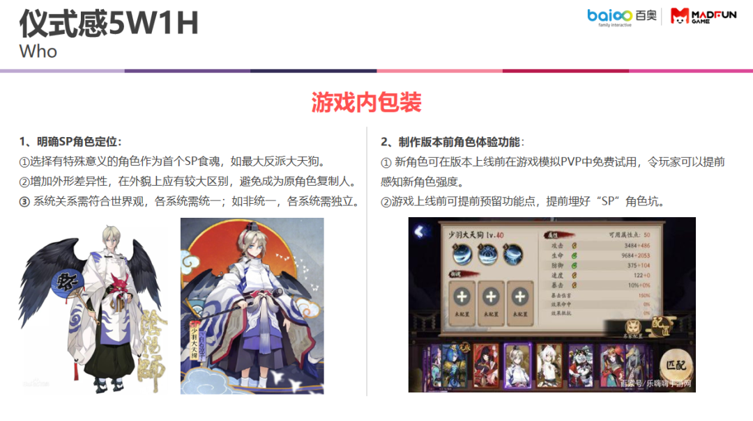 在游戏内的包装,网易选择了有特殊意义的角色——《阴阳师》初期最大的一个反派大天狗。并且增加了外形差异性,选择了大天狗的幼态形象,更具反差萌,能弱化玩家的注意力。