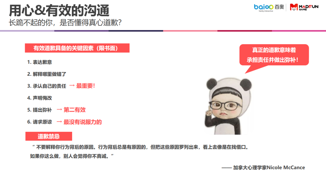 第三,情感切入,表达直接。有了初步的诚意,再处理问题的时候一定要注意换位思考,玩家能够接受的处理方式和态度是怎么样的,你给出的策略和说辞是否能被她们接受。要仔细拆解每一个问题的细节,可能她们提出的只是一个诉求,但你需要把这个诉求对应的解决方式一一给出来,这就是我们的诚意。