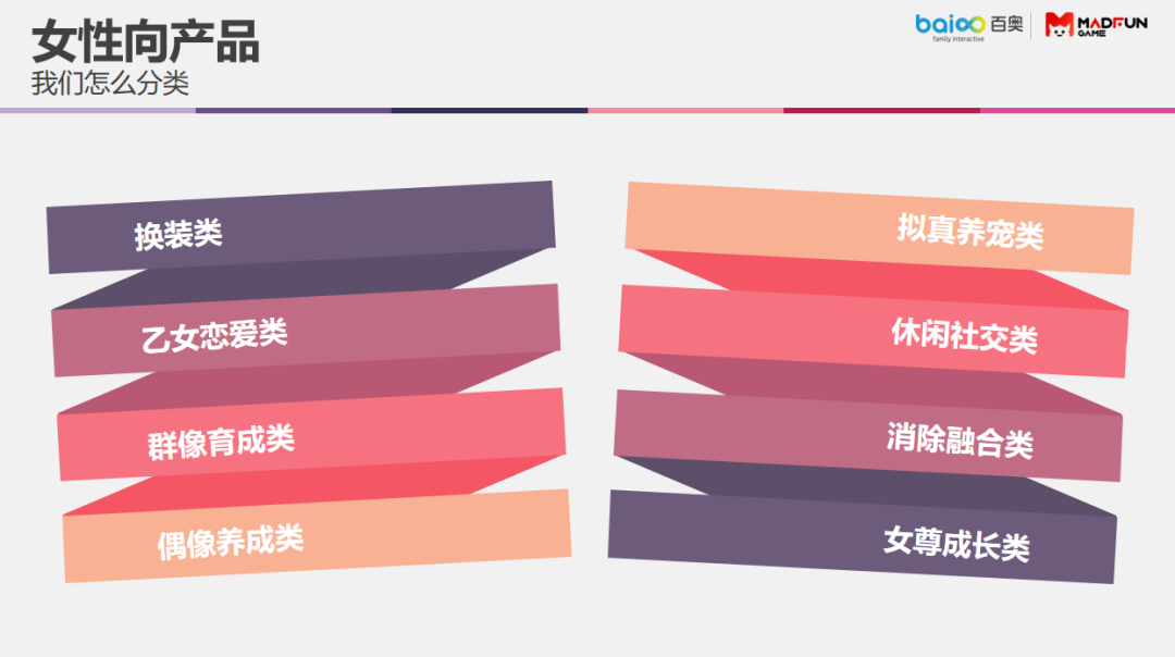 换装类,就是以暖暖系列为代表的;乙女恋爱类,以《恋与制作人》为代表;群像育成类,比如《食物语》;偶像养成类,比如《偶像梦幻祭》;拟真养宠类,比如《旅行青蛙》;休闲社交类,比如《奥比岛》;消除融合类,比如《梦幻花园》、《梦幻家园》;女尊成长类,在国内是宫廷,在海外的话可能有不同的题材。