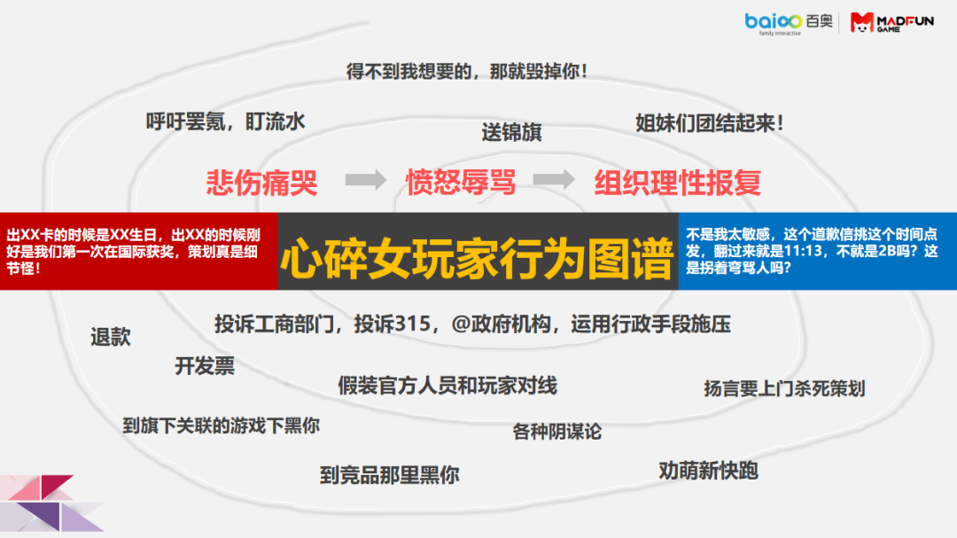 对此,我们总结了女性玩家在遇到舆情事件,且游戏处理不当后的行为逻辑。首先可能是悲伤痛哭,之后就感到愤怒,抱团辱骂,接下来会去组织一个比较理性的报复。她们甚至会通过扬言“上门杀策划”、假装官方与玩家对线等各种你想得到和想不到的一些方式来表达情感。