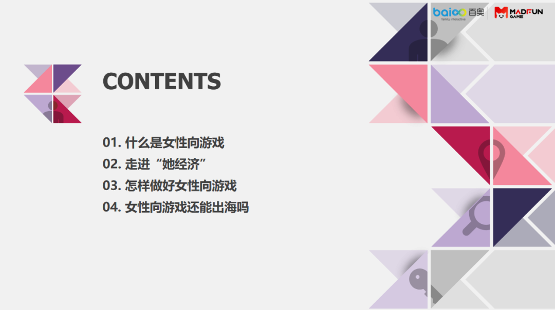 在Evan看来,出海可能会遇到本地化等难题,但女性向游戏产品的运营,在全球市场都是根本。他重新对女性向游戏下了定义——目标用户以女性为主,强调满足玩家的审美、陪伴和社交需求的游戏,并且着重分析了女性用户的特点、诉求,就如何做好女性向游戏的运营做了详细的案例分析和经验总结,相信大家看完都会有所收获。