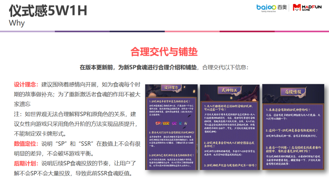 同时,网易花了很大的功夫合理介绍和铺垫这个SP卡牌推出的原因,比如式神的设计理念,数值定位,后期计划。他们解释了这个SP卡牌的作用不是来稀释现在玩家的游戏平衡,而是为了激活老式神的作用不被大家所遗忘,同时预告后面还会有新的SP式神。
