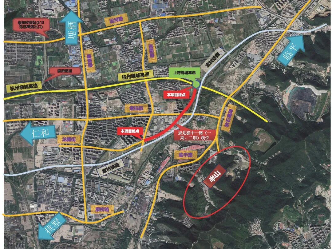 崇贤新城横十一路一期项目为崇贤新城“二横四纵”道路规划的主干道龙腾街的延伸,一期道路南起规划地块,北至绕城高速,道路全长约为340m,道路红线宽度为38m(上跨高速预留段红线宽 55m)。设计标准参考城市道路60km/h设计速度。主要建设内容包括道路工程、管线工程、绿化工程、照明工程、交通安全设施、智能化设施及其他附属工程等。