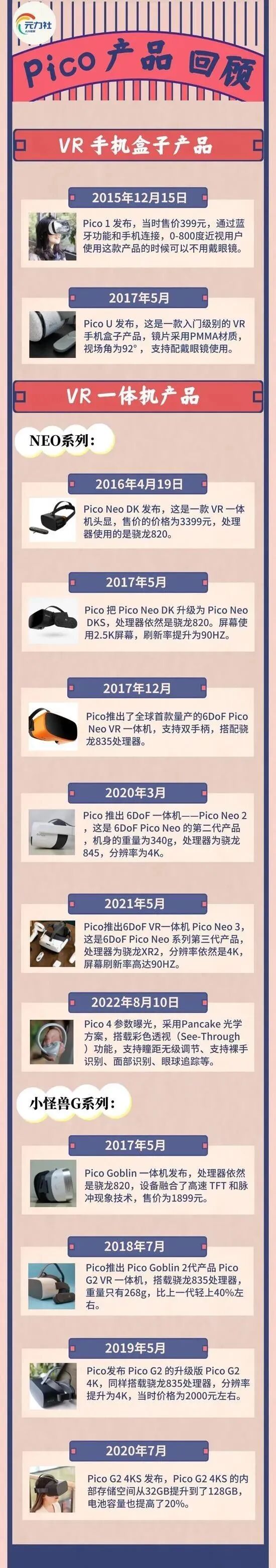 无论如何,从曝出新技术路线和功能创新来看,Pico 4 发布后有望成为全球范围内的标杆产品,在 Pico 品牌的发展史上画上浓墨重彩的一笔。为此,我们整理了从 2015 年至今,Pico 历年推出的 VR 硬件设备,从产品角度回顾国产 VR 硬件厂商的崛起之路。