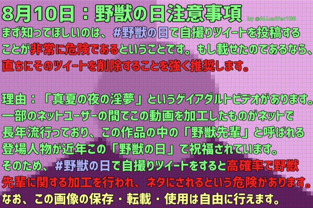 所谓的“野兽之日”,说白了就是日本网友们为纪念那位著名的野兽先辈,而恶搞出来的一个非官方节日——类似于我们这儿用于整活的疯狂星期四。不过,人家那既不是商家搞出来的营销噱头,也没有夸张到每周都要举办,纯粹是个靠网友整活而出名的节日。因为日语中8和10连起来读的发音“yaju”,恰好是“野兽”的谐音,所以8月10日这天就成了“野兽之日”。