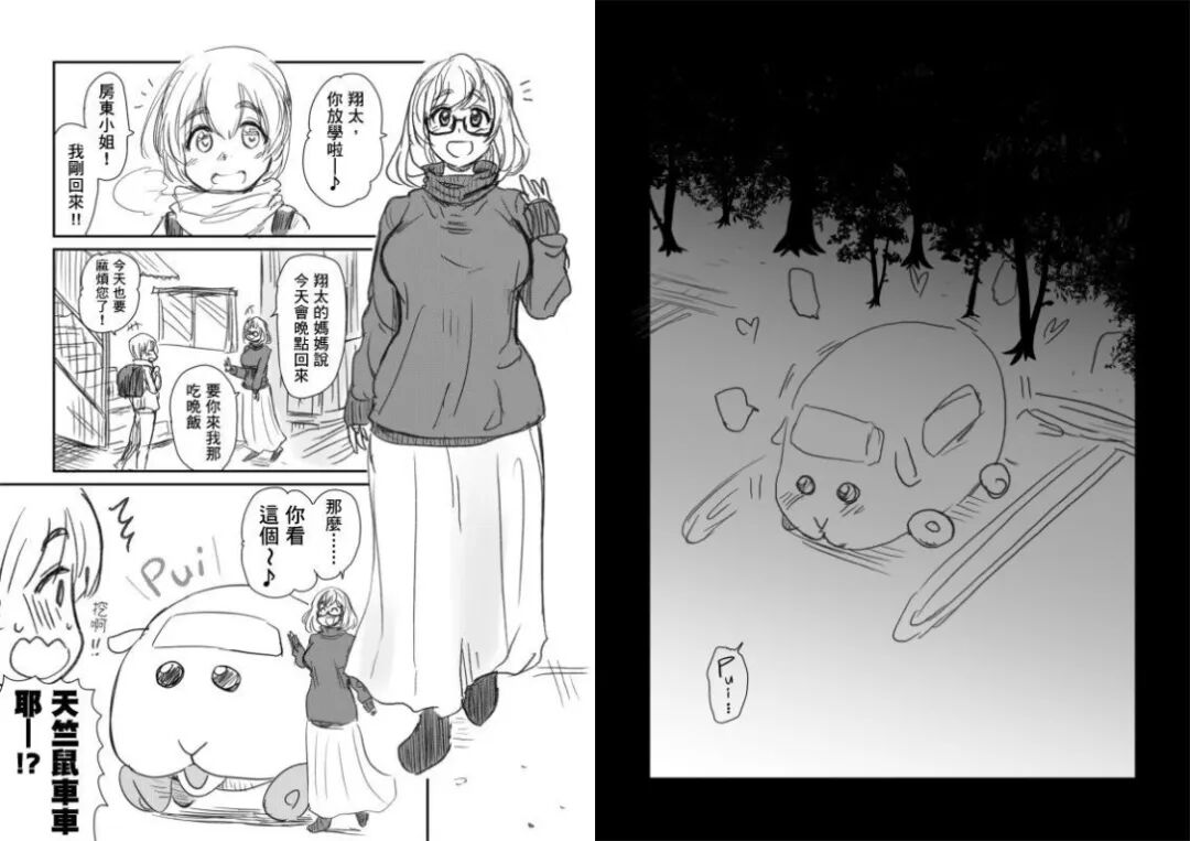 除了前面提到的那部漫画,搜索《天竺鼠车车》还能找到另一些18禁同人。比起内容温和的前者,这些内容就要露骨得多。有的只是以车车作为噱头,还是讲那些房东与房客的老掉牙故事;有的则跨越了物种与体型,出现了“人车合体”的离谱情节。