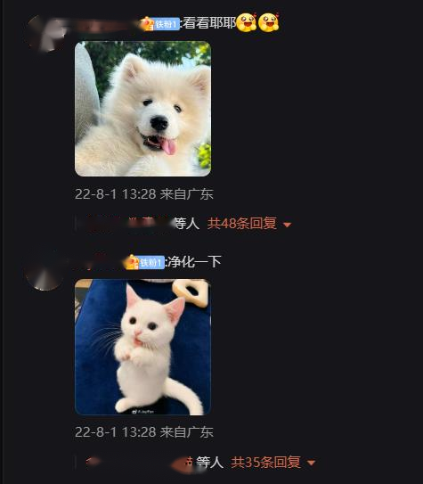 而心存善意的网友们,为了抵御这些“菜花”的攻击,常常也自发在评论区里,发布各种可爱的猫猫狗狗的照片,试图净化这种出于人类生理本能的恐惧。