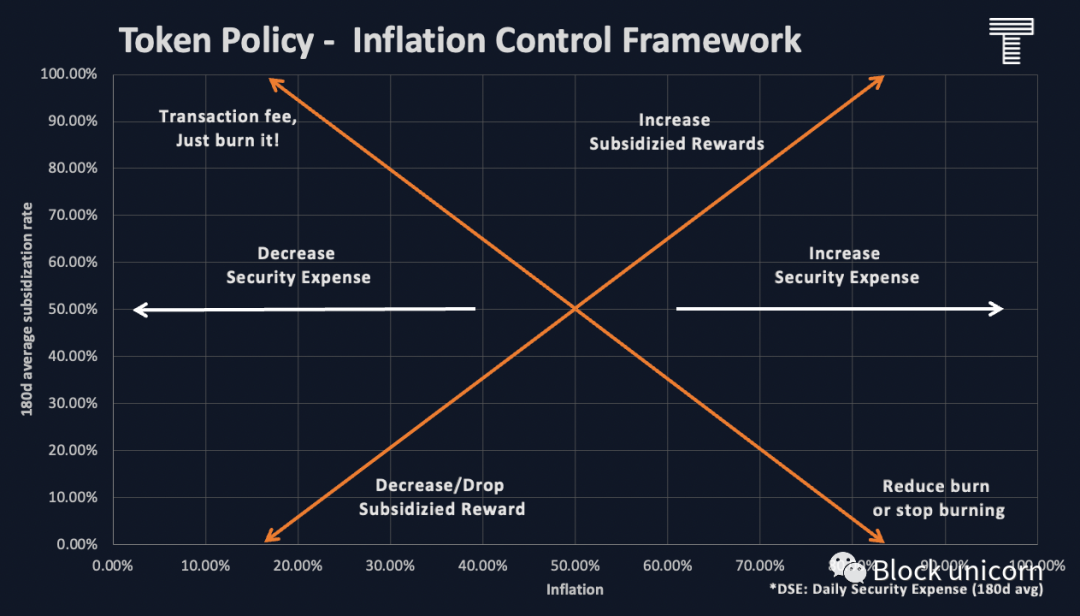 从图表中,我们可以看到,以太坊通过燃烧(销毁)80%-90%的交易费用,大大降低了他们的通货膨胀率(从2.65%到0.5%),因为交易费用本来可以覆盖50%-70%的网络安全成本。这个代币政策(EIP-1559)将网络的日常安全成本减少了42%(从4700万美元到3300万美元)。如果一个国家的GDP很小,但它决定印钱来资助其国防,这通常会导致高通货膨胀。能够直观看到网络的支出,以及谁在资助这些支出,可以帮助社区在代币政策和可持续的代币经济学方面做出更好的决定。项目可以在图表中向上自行移动,而不需要更改任何代币政策。当更多的用户需要他们的区块空间时,他们的协议收入(总交易费用)将会增加。举个例子来说吧,如果Polygon的协议收益(总gas费用)开始显著增加,他们便会在图表上下滑动,从而给他们提供空间,要么去减少质押奖励,要么开始燃烧交易费用。虽然Avalanche可能一眼看上去很极端,因为他们是一个年轻的项目,有着积极的发展战略,但他们的代币政策是燃烧100%的交易费,明确的围绕着实现长期通货紧缩而制定。有了这个政策,Gas收入增长的通缩效应要比其他协议大得多。一旦协议收入足够高,这种代币政策可能会帮助AVAX迅速转变,实现长期的通货紧缩目标,同时以可预测的补贴奖励保持安全水平。任何区块链社区在决定其代币政策时都应考虑一系列复杂的目标,包括安全级别的要求。下面的框架在奖励率和通货膨胀方面,提供了一个有用的决策点图。![]()