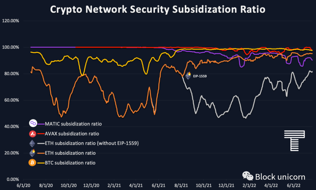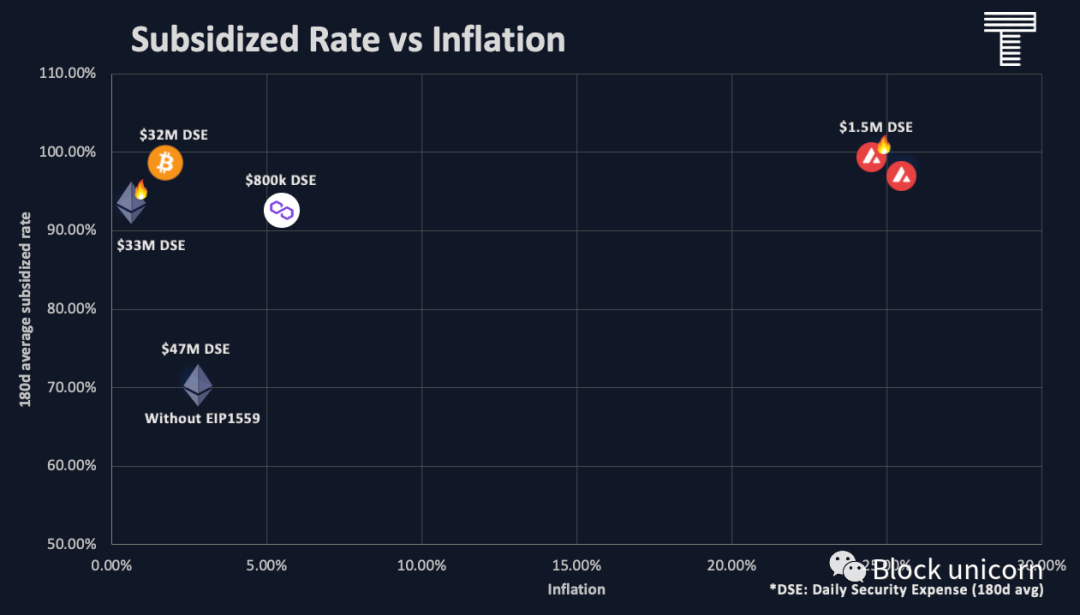 市场上最顶层的第1层项目,如比特币、以太坊、Avalanche和Polygon,大部分的安全费用都在85%—100%的补贴率上下波动,这也意味着交易费用只占网络 “ 安全费用 ” 的5%—20%。以太坊,如果没有EIP1559,最接近于无补贴网络。在牛市高峰期,以太坊协议的收入(Gas费用)可以覆盖50%-70%的 "安全支出",而其他网络仍然严重依赖补贴的奖励。我们还可以在图表上绘制180天平均的每日安全费用补贴率)与代币的通货膨胀率,以查看政策控制的影响,以及确定项目可能采取什么政策来改善代币经济。![]()