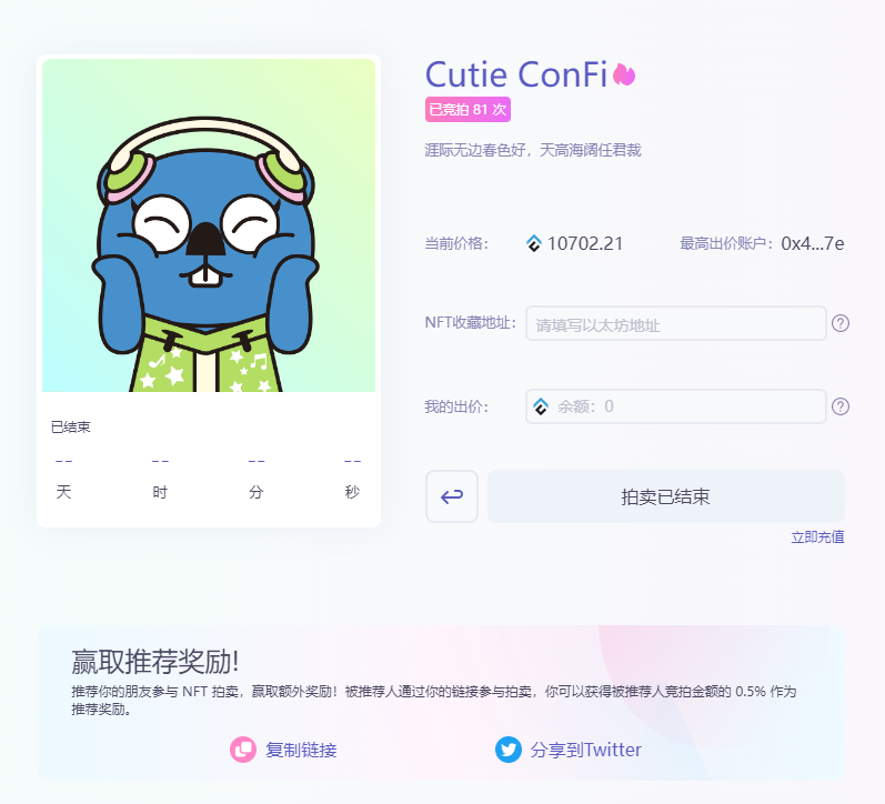 每次抢拍时的最低出价必须高于当前价格的 5%以上才能成功,而这 5%差额将作为收益按比例分配给艺术家、被抢拍者以及过往 NFT 持有者,除了之前的规则外,我们还可以赢取额外的推荐收益。把你的拍卖链接分享给你的朋友你可以获得0.5%的奖励,具体分配比例为: