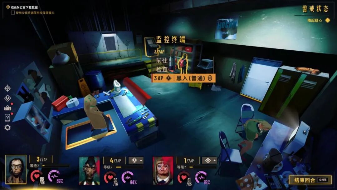 因为《黄金魁犬:序章》是反乌托邦题材的游戏,它就不可避免地存在大量潜入企业,间谍渗入与反间谍渗入场景。玩家在这些场景中要面对大量的场景互动,就需要有选择地进行筛选,一旦行动点耗尽,就只能结束回合恢复点数。
