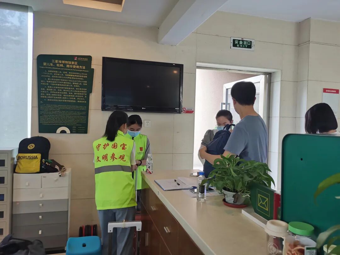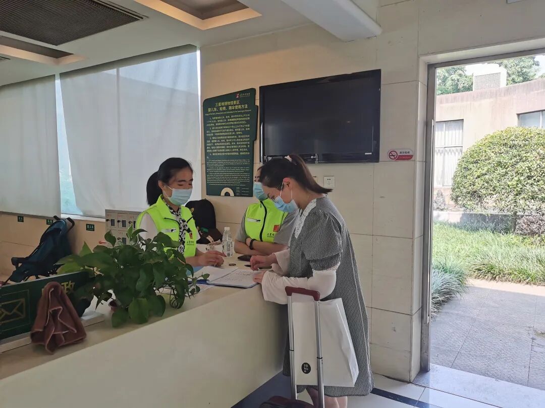 我的工作台位于三星堆博物馆的游客中心,这里是大家来到博物馆最先踏足的地方,而我的工作任务就是负责保管好大家的行李、回答大家的问题。(没错,我堆提供免费行李寄存服务,大家带大件行李来逛博物馆可以不用慌!)以前在学校,我从未想过当有一天站在游客中心的服务台前,面对来自五湖四海的游客朋友提出的各种各样的新奇问题时,我该如何应对。于是在进入志愿者这个陌生而有趣角色的第一天,我只能用“一个一头雾水、手足无措的社恐人士”来形容自己。