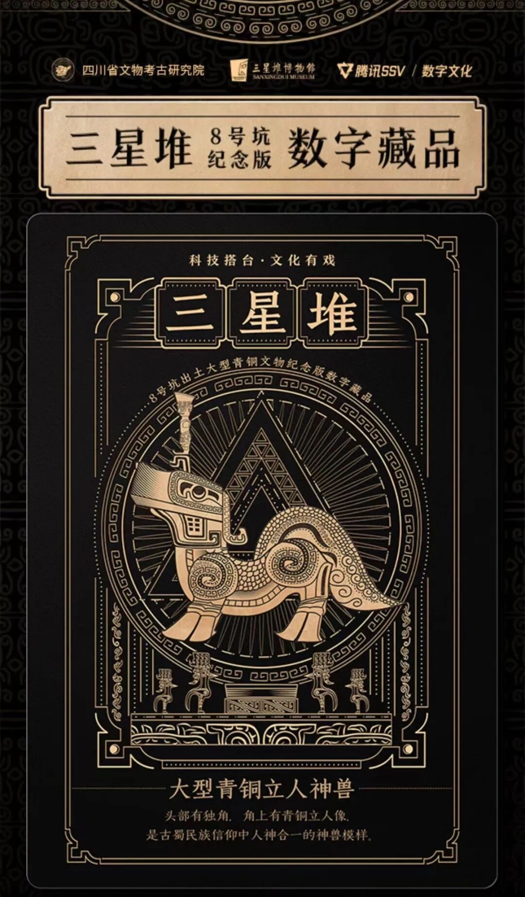 在四川省文物考古研究院三星堆考古研究所专家推荐下,我们以8号坑 3个拟出土文物(青铜神坛、青铜立人神兽、着裙立人像)为原型,创意设计并在上链铸造了三款纪念版数字藏品,运用区块链技术保障藏品的版权存证和唯一属性标识。由三星堆博物馆作为藏品发行方,6月14日已随“古蜀藏品 等你来挖”H5上线,青铜神坛、青铜立人神兽两款数字藏品开始公益发行随即被领取一空,6月15日,直播报道着裙立人像在8号坑被顺利提取,由着裙立人像创作的第三款数字藏品随之正式上线发行。